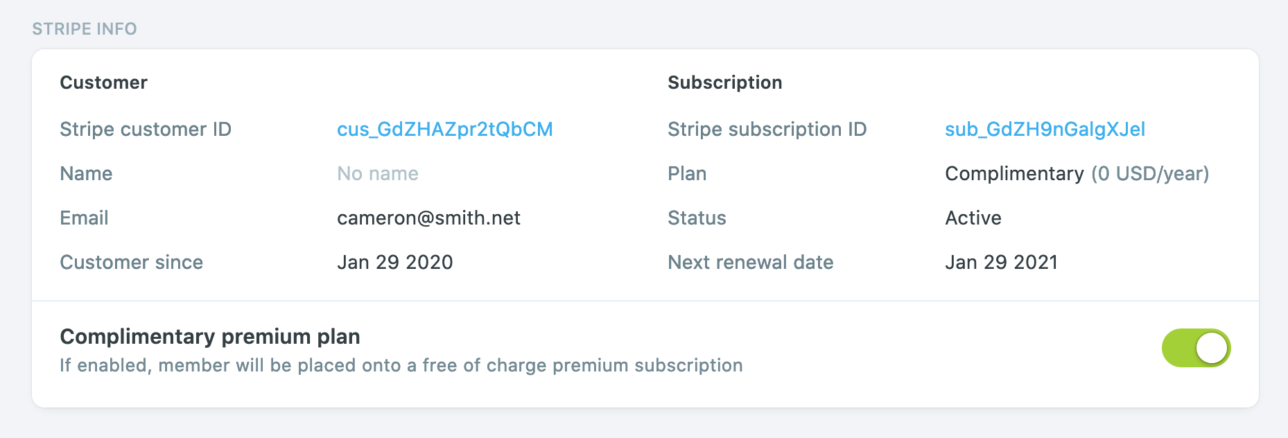 Simply navigate to the member profile you'd like to provide free access to, and toggle "Complimentary premium plan"