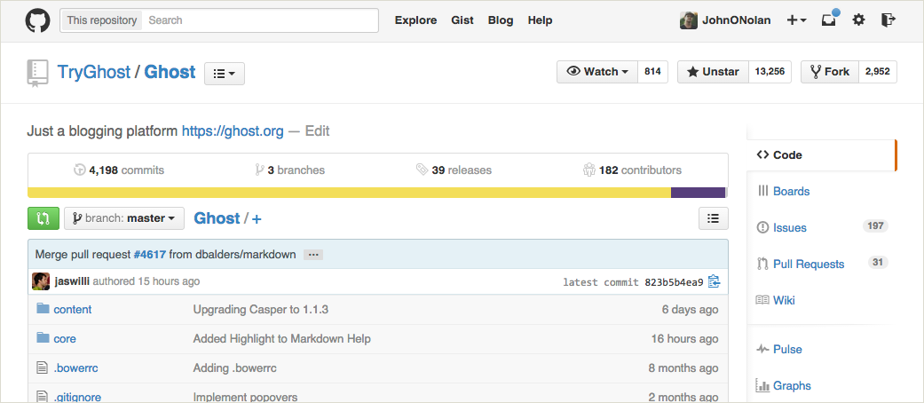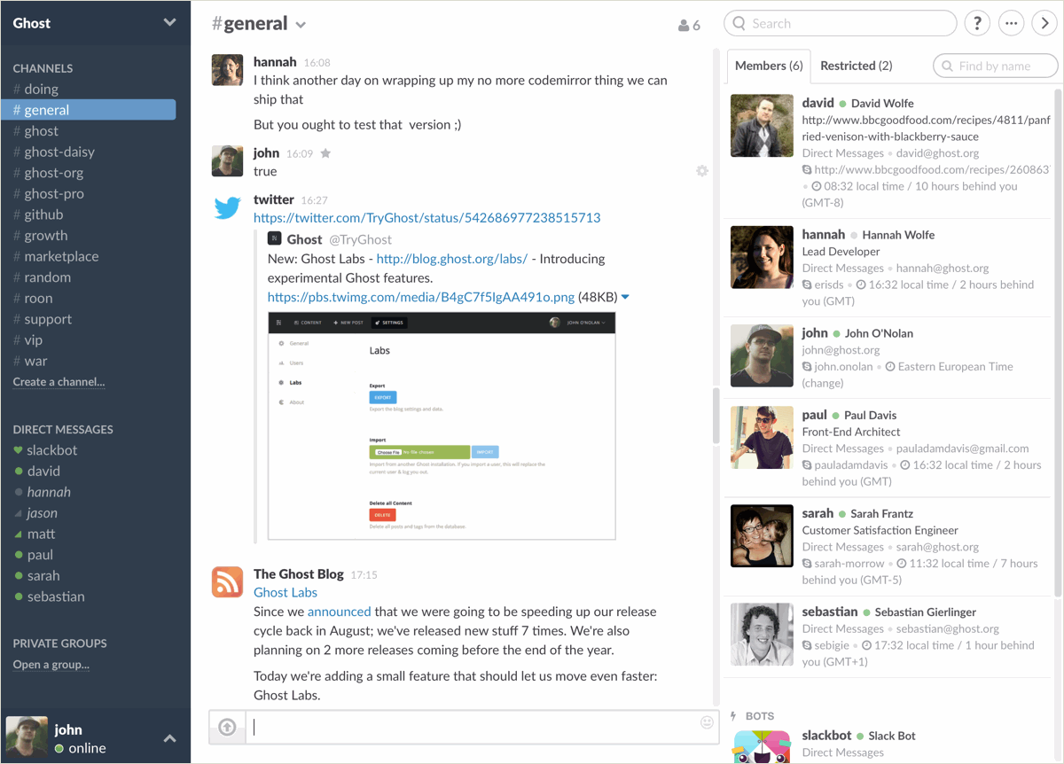 Some people refer to Slack as a team-chat app, but really it's so much more than that. Slack is our remote office. If you're on Slack: You're at work. It doesn't just allow us to talk to each other easily, it also pipes in feeds of all activity happening in our other tools. We see when new commits go in via Github, when goals are updated on Trello, when Pingdom tells us one of our servers is down, or when a new Ghost(Pro) customer converts.
