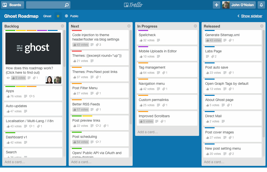 We use Trello to organise our medium to long-term plans. The Ghost public roadmap is one example of this. We also use a few other boards internally to keep track of progress on larger projects.