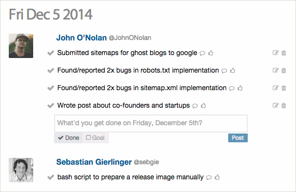 We tried lots of alternatives prior to iDoneThis. From WordPress/P2 logs to dedicated Slack Channels. Nothing worked quite as well.