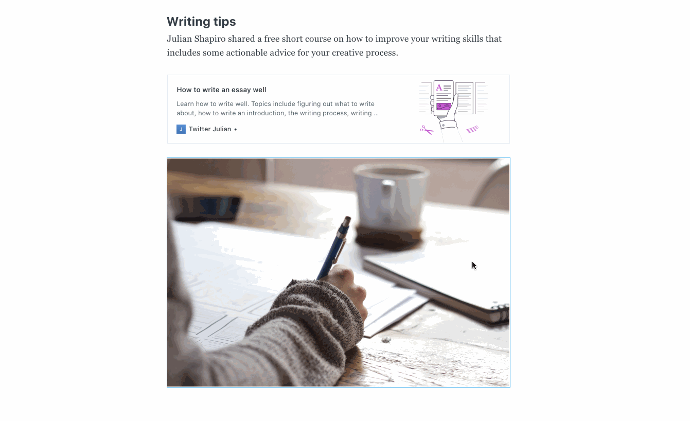 Up until now it was not possible to move rich cards around in the editor. Now you can simply drag and drop any card within a post to the appropriate place.