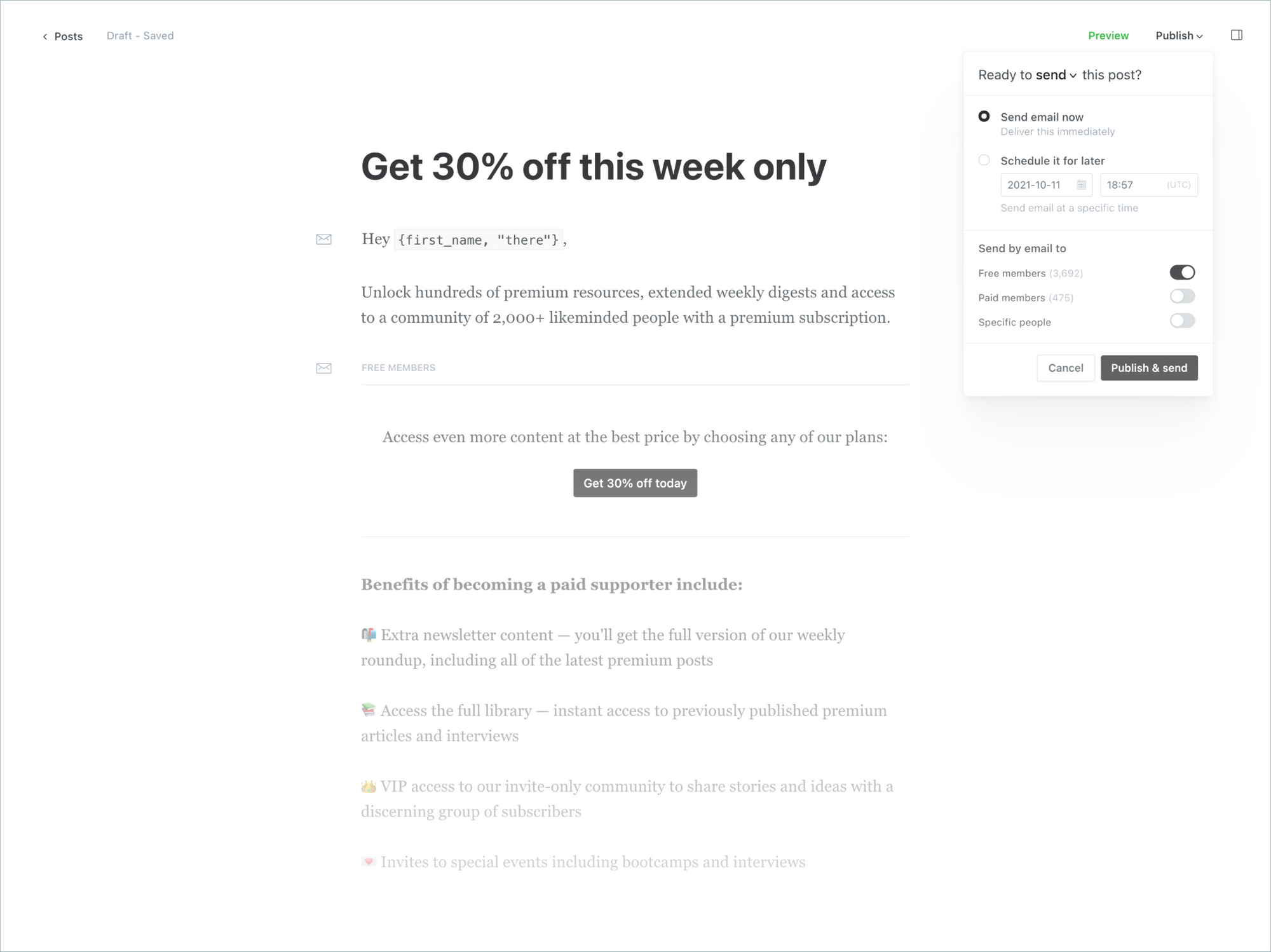 Now you can send emails to your audience with private content that won't appear anywhere else, for example: