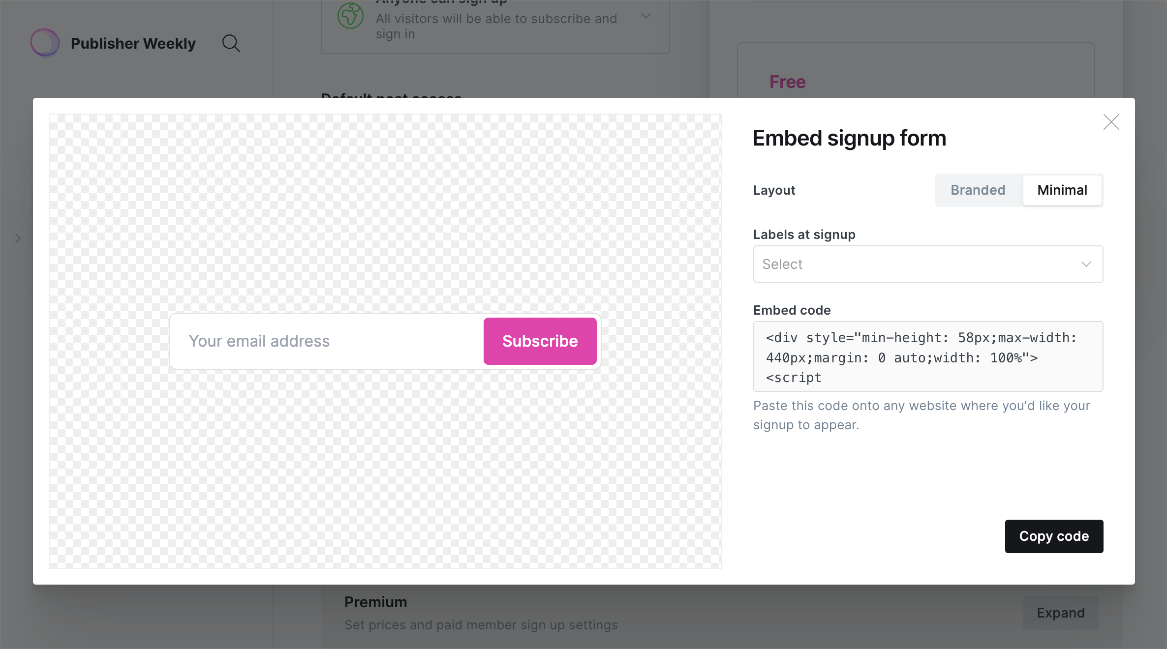 Include your logo, publication name, and description in your signup form, and optionally select a custom background color to fully promote your brand.