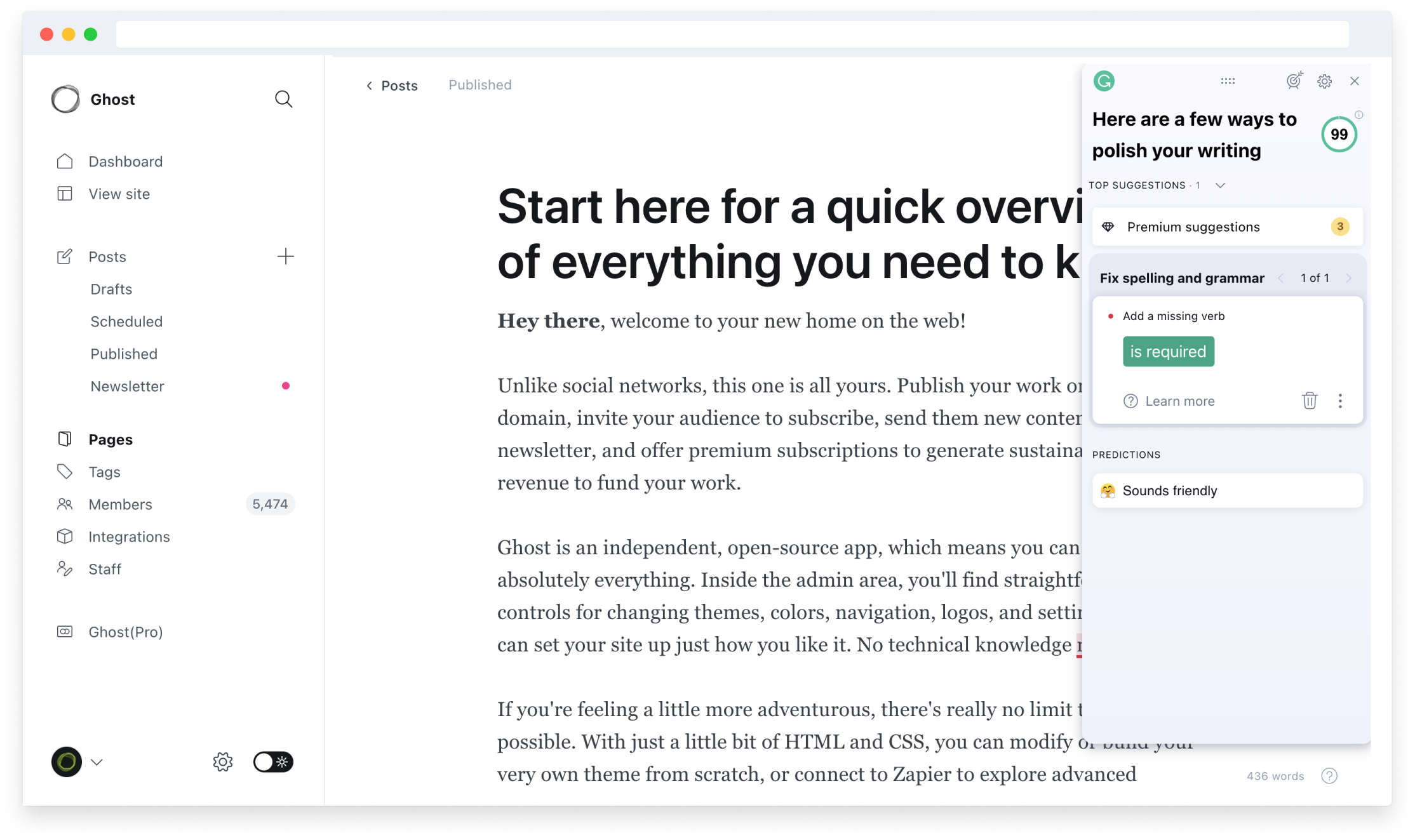 The Ghost editor now has official support for Grammarly. All you need to do is install the Grammarly extension for your preferred browser and you can start using the AI powered writing assistant inside Ghost, to improve your writing as you type.