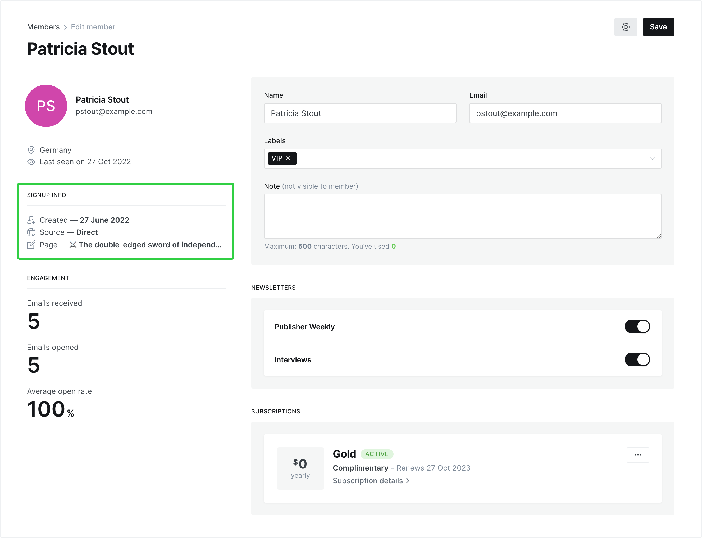 For every new free member signup, and every new paid subscription, Ghost now shows you where on the web that person came from as well as what post or page they were on when they converted, right on the member profile page.