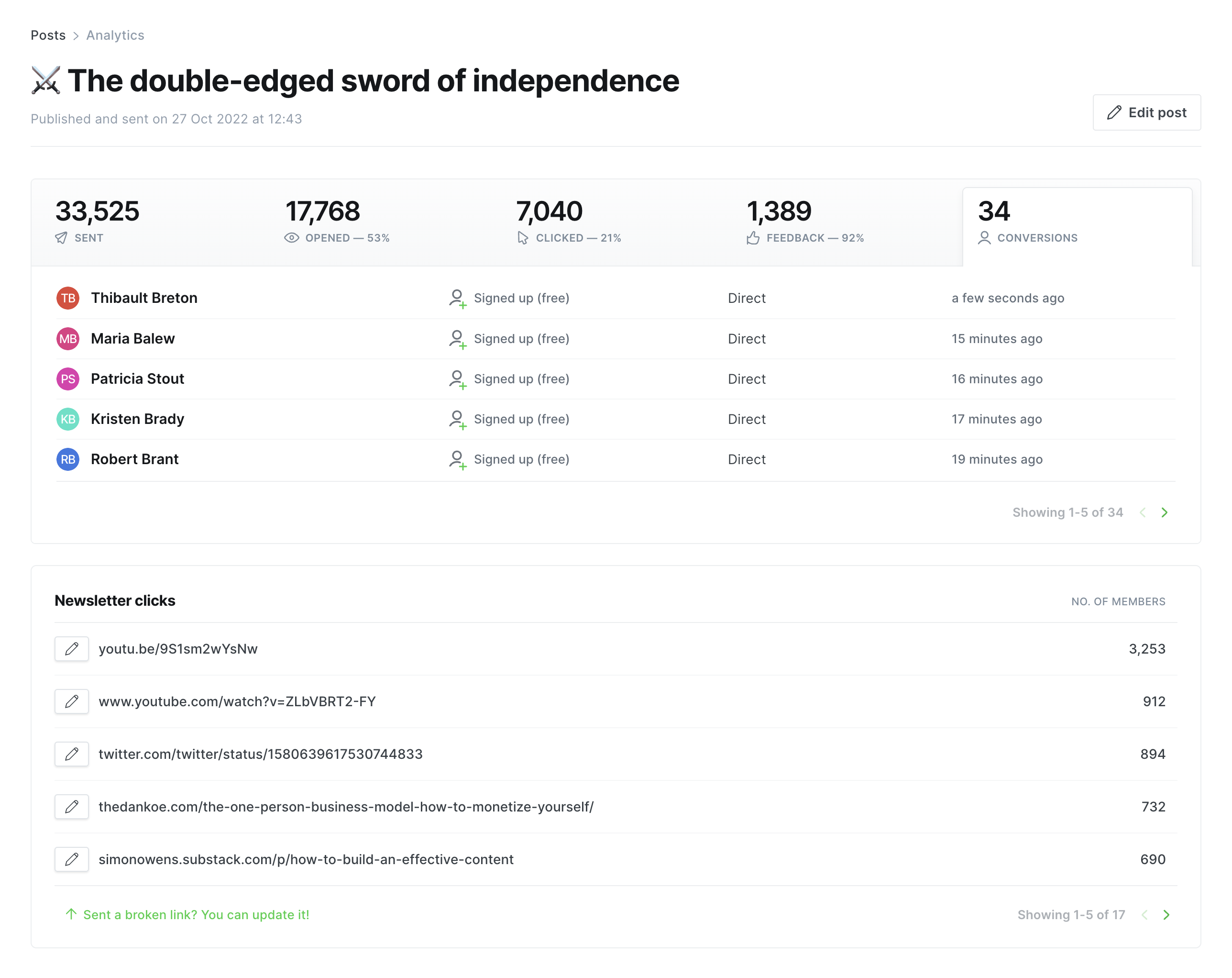 Over on your post analytics, you can now see the number of free signups and paid conversions generated by that specific post, along with the referral sources where those members came from — giving you a deeper understanding of how successful each piece of content is, and how people are finding your work.