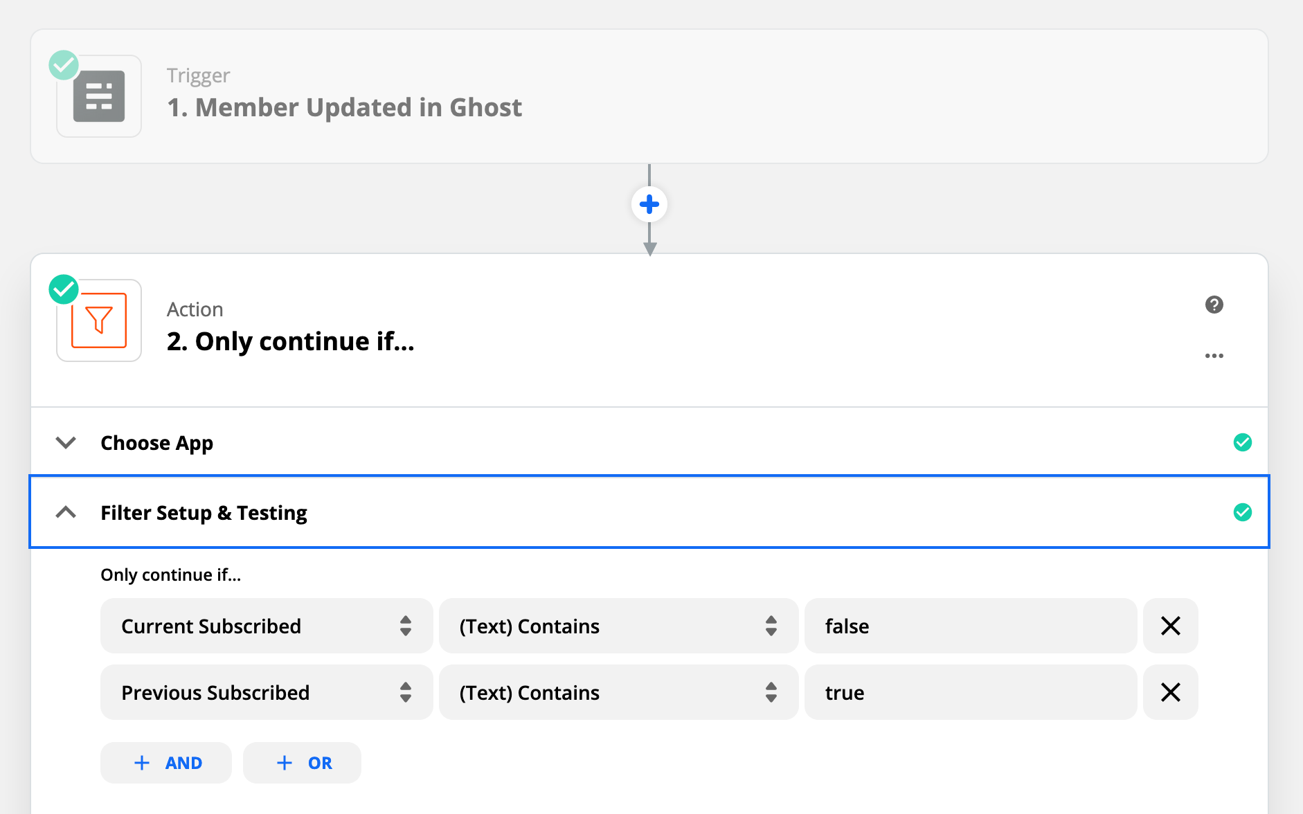 For example, if you wanted to apply a label of unsubscribed when a member opts out of your email newsletter, apply a filter step for the current subscribed status and the previous subscribed status. Any members who match the filter will move to the next action step, and have a label applied.
