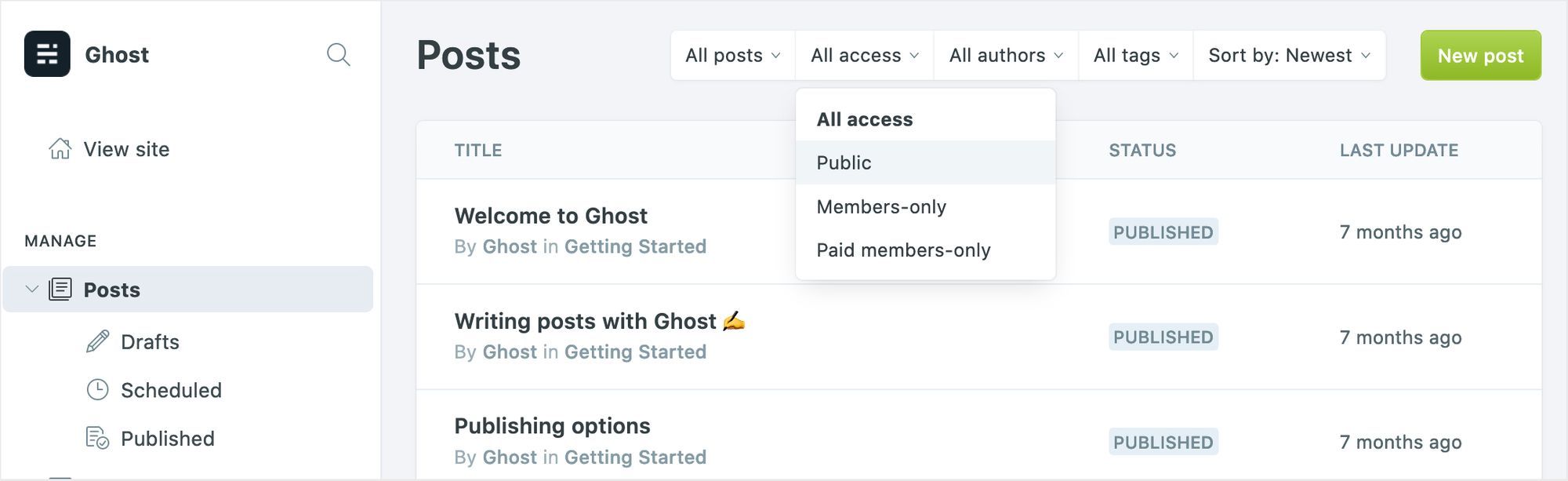 You can now filter posts by access level, to browse and edit content that has been created for different segments of your audience.