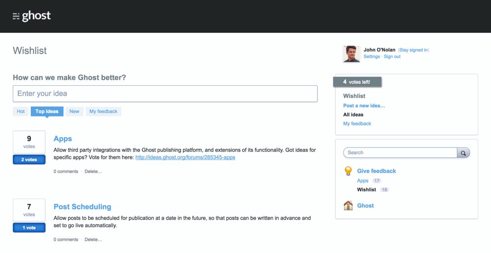 The wishlist menu item now will take you over to our new Uservoice feedback forum where you can submit as well as vote on the features and ideas which you would like to see in Ghost. Much simpler.