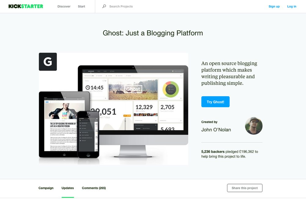 On April 29th, 2013 - Ghost launched on Kickstarter with an idea for a brand new blogging platform. Just 29 days later it had blown away its fundraising goal by more than 800% and raised $300,000 in the process.