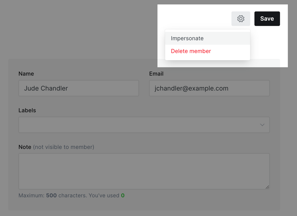 To impersonate a member, click the gear icon, and select Impersonate. You can copy the impersonation link and paste this into a new browser tab to login as the member.