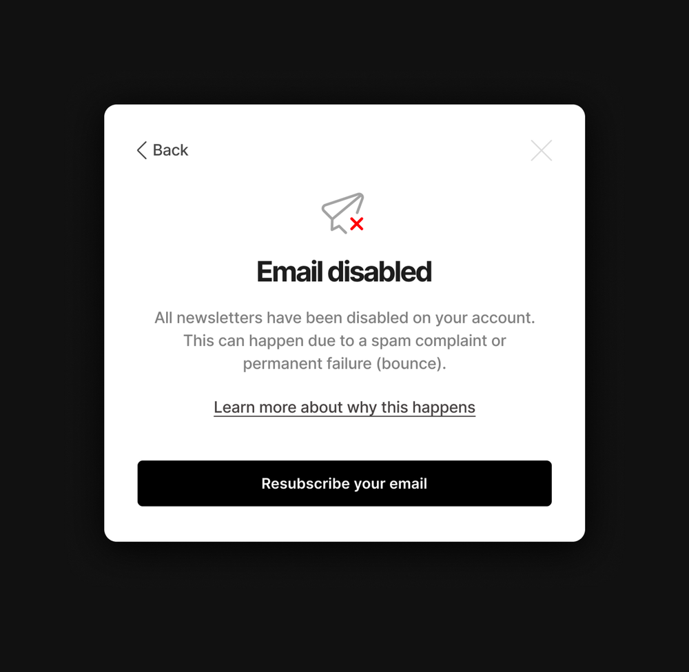 If your member’s email address was disabled accidentally, or they would like to start receiving emails again, they can resubscribe themselves directly from their account settings on your publication.