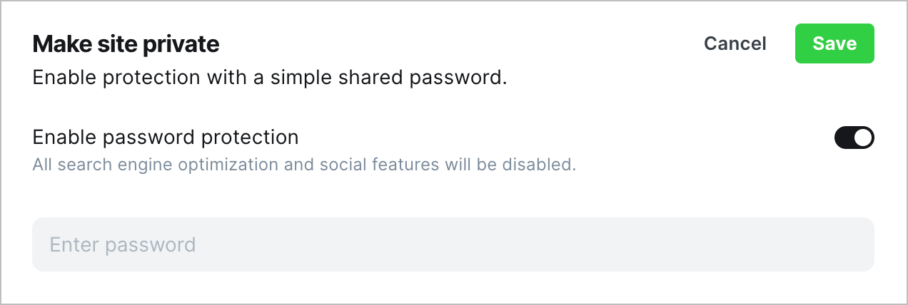 When private site mode is on, all search engine optimization features are switched off to keep your site under the radar.