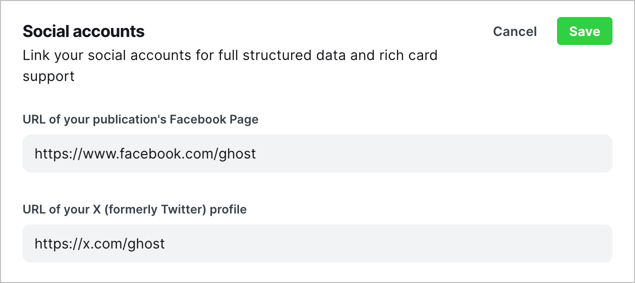 To include links to your Facebook and X profile and page, click Edit from the Settings → General → Social accounts area. When custom profile links are added, these will be associated with icons used across your site within your theme.