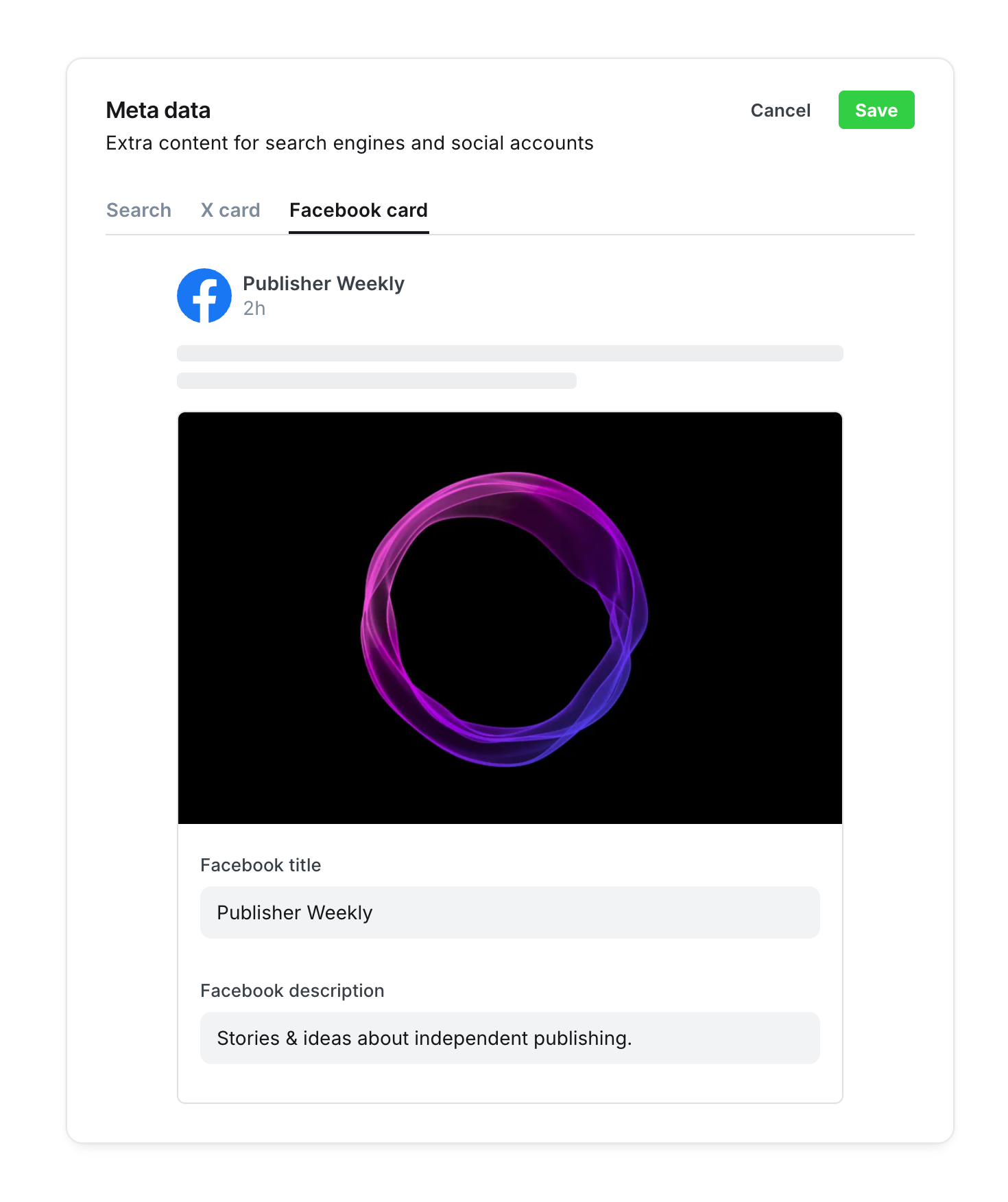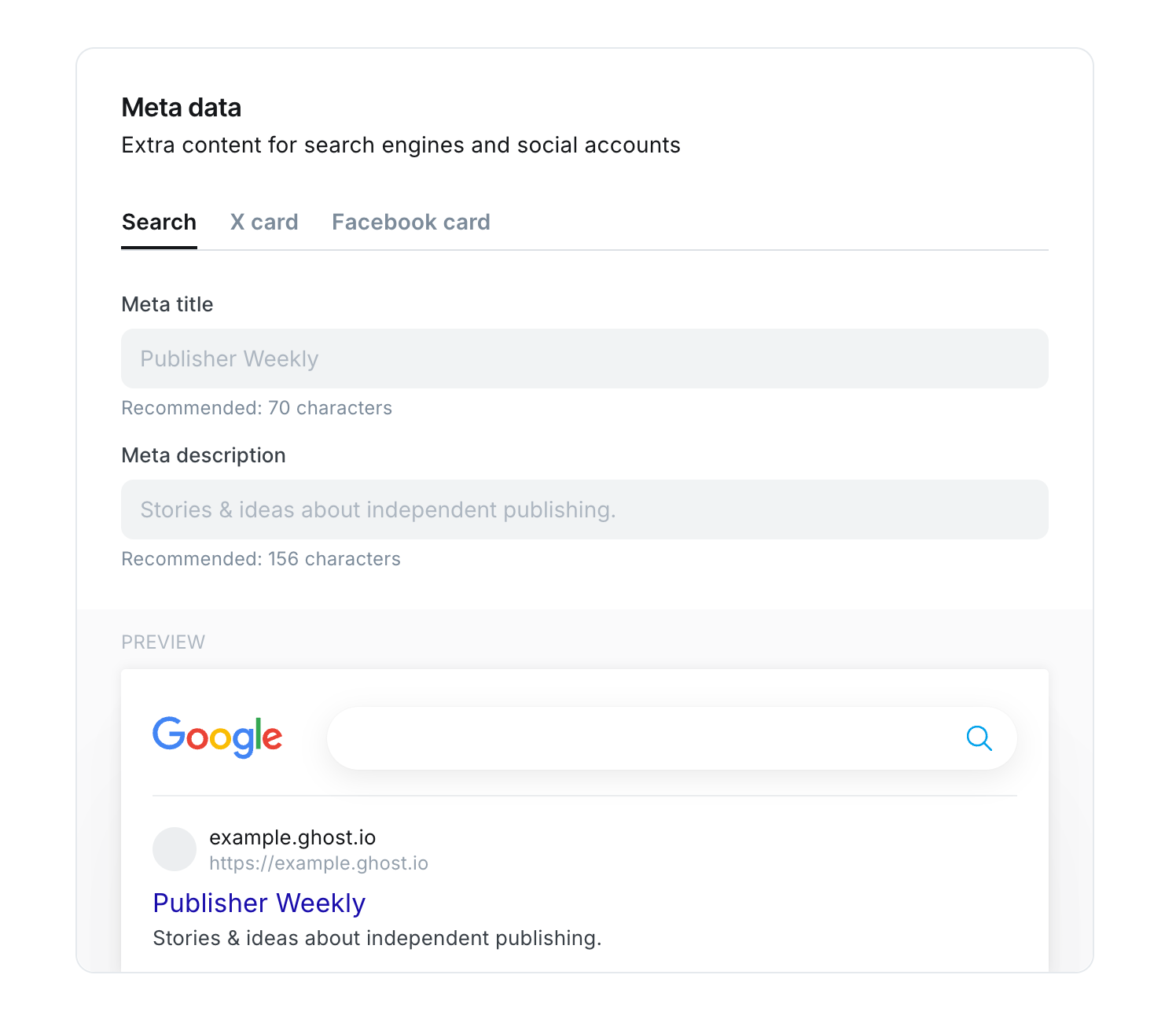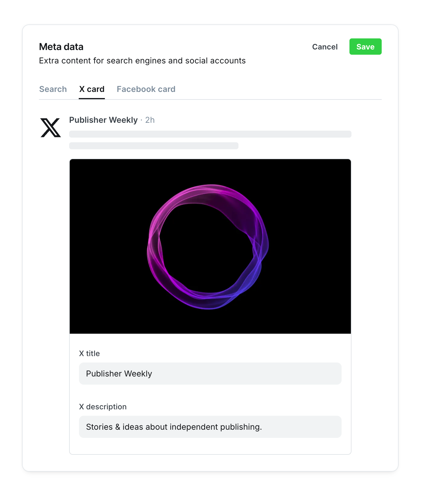 Customize how your site address is rendered when shared across X (formerly Twitter) by customizing the data in the Settings → General → Meta data → X card area. When your site address is shared across X, your custom card data will be rendered.