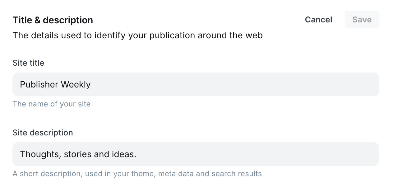The title and description will be used across your publication, to help readers identify your site around the web.