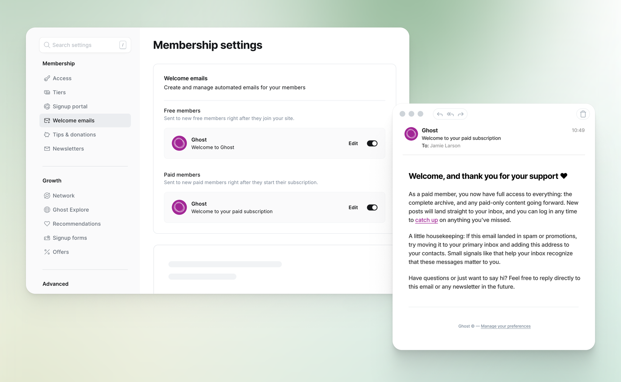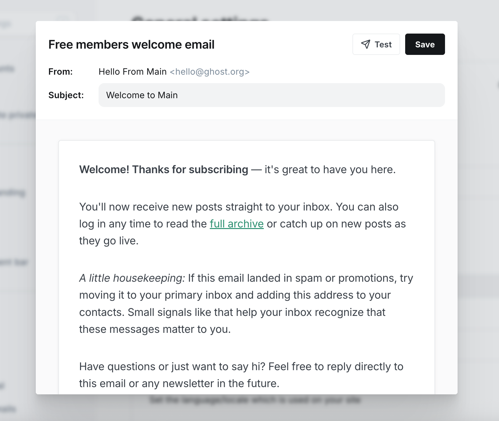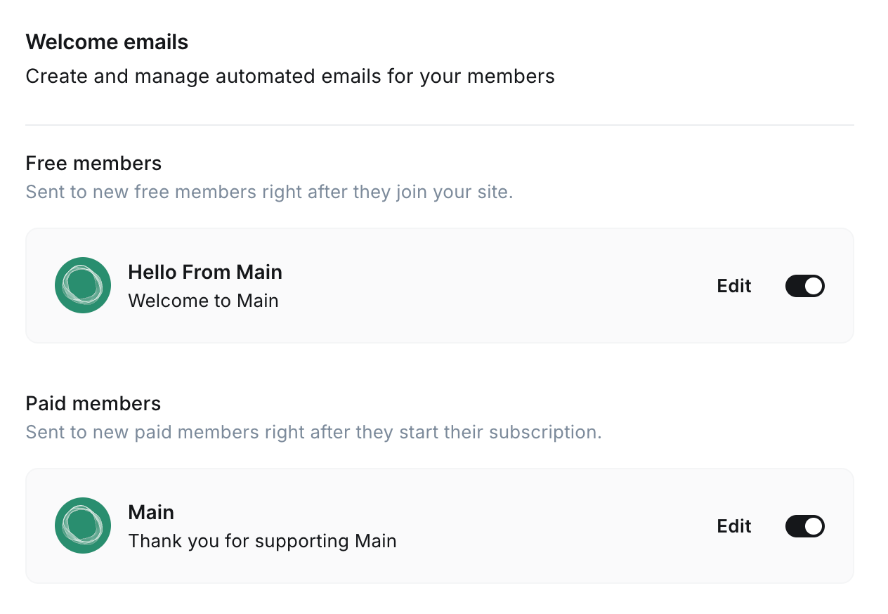 Once enabled, new subscribers will receive a welcome email when they signup to your site. These can be tailored for free members, as well as paid members (if you have paid membership enabled).