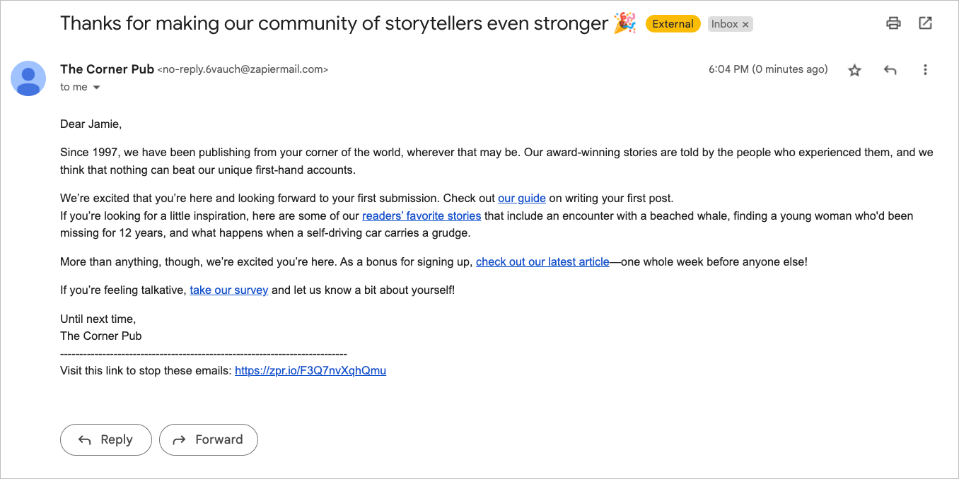 Make your first impression count by connecting Ghost and Zapier to send new members a welcome email. It gives you the chance to thank your member for signing up and jumpstarts their onboarding experience.